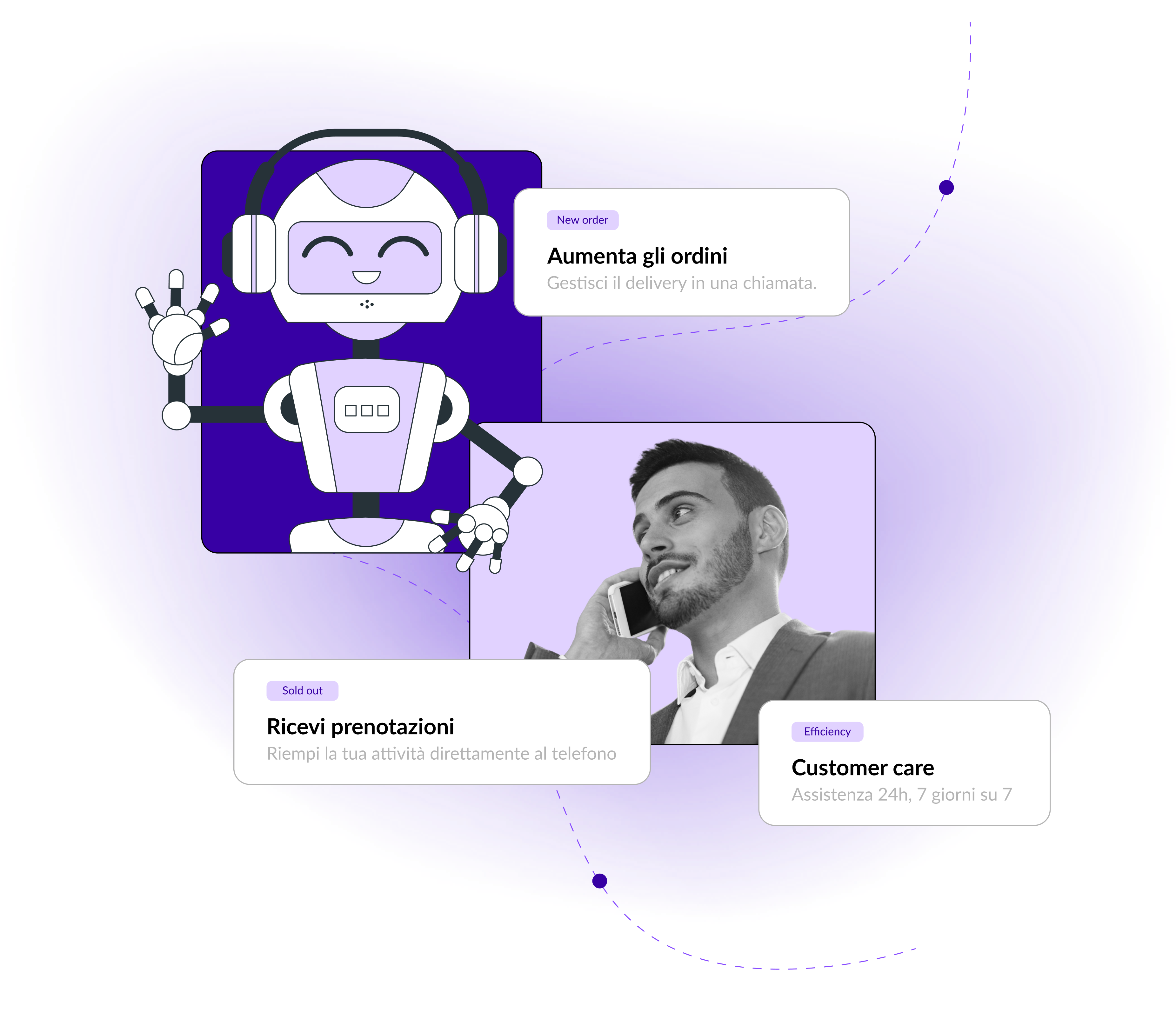 Ricevi prenotazioni, gestisci ordini, coordina il delivery e rispondi alle domande dei tuoi clienti in modo efficiente, professionale e senza perdere mai una chiamata.